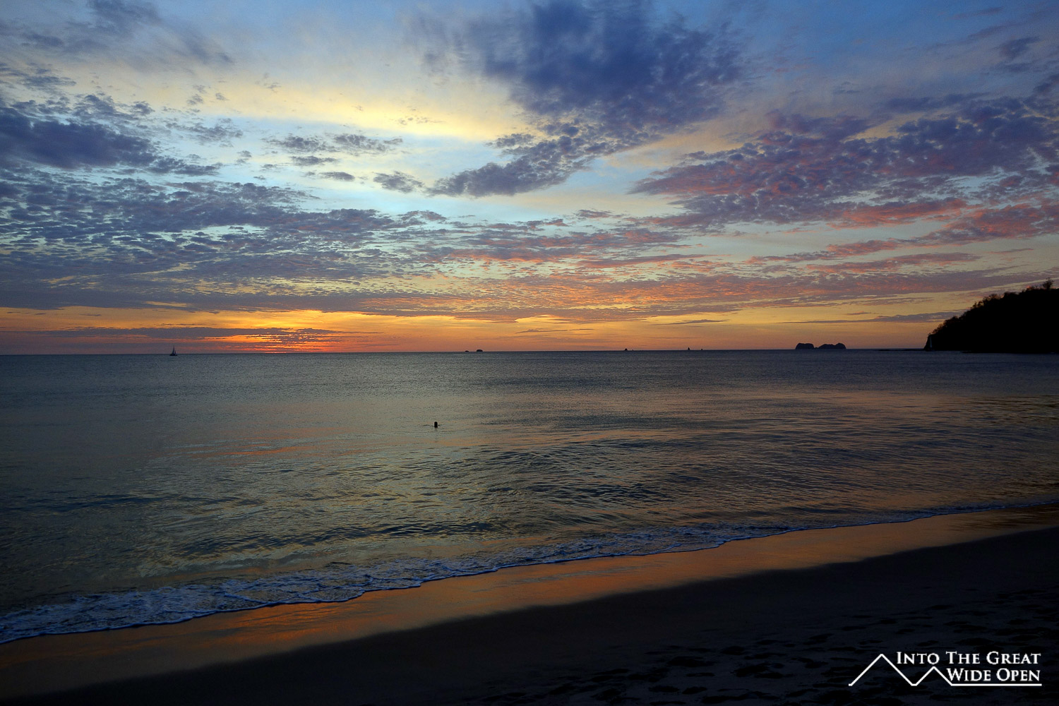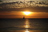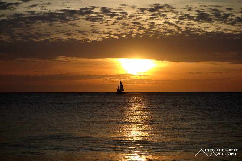 A sailboat passes by the sunset at Playa Flamingo