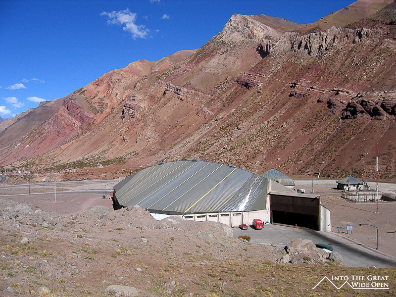 I had also wanted to see Aconcagua up close. Following a consultation with the park rangers, the intention was to camp inside Parque Nacional Aconcagua for one night and then hike into the valley to see the south face and the glaciers of the mountain, the thickest of which is about 300 meters thick. The rangers told us that even though we didn´t have a tent that there was some type of structure that we could stay in overnight, although it would be cold as temperatures would be close to freezing. It was a bit late in the season so there were no companies still renting out camping equipment in the town or the park. We stocked up on enough food and water, mostly salami and cheese, as the small food store in town didn´t have much else, and headed off toward the park on foot since no one would drive us there. All along the road there were 4 meter tall metal poles used to mark the sides of the road and to measure the height of the snow. I thought this was excessive but then I saw the photo of a truck driving between two towering walls of snow after a blizzard in 1997; it was impressive and I understood.