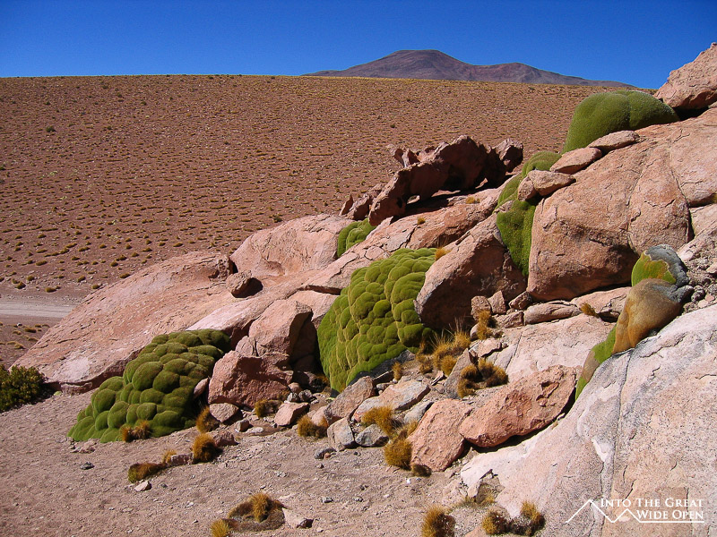 The third day began with spectacular views of Laguna Colorado, a brightly red colored lake resulting from the algae and clay that are in abundance in the lake. In the slightly warmer summer months there are hundreds of flamingos but now at the dawn of winter many had migrated to other locations. There were a few flamingos still hanging around the lake and we were able to get some good photos of them in the water with the pink on red contrast. The bright red lake is also bordered by some blindingly white salt flats and ringed by towering mountains creating an almost surreal atmosphere. North of the Laguna Colorado we reached what is known as the Rock Tree, a strangely tree-shaped rock formation nearby some other rock groups that tower up out of the sandy ground. Further on there was another rock group where we stopped for lunch that showcased the bright green algae or moss that grows on top of some of the rocks forming a stark color contrast amidst the arid desert. We passed a series of four or so lakes and a salt flat where the gusting wind was driving the salt dust high into the air forming towering white clouds over the white ground. There was also the viewpoint to Volcan Ollague, which, at a height of about 6000m, also sits near the Chilean border. Our third and final night was spent on the edge of the Salar de Uyuni. It was not quite as cold as the previous two nights as we had descended about a thousand feet or so.