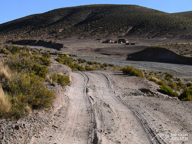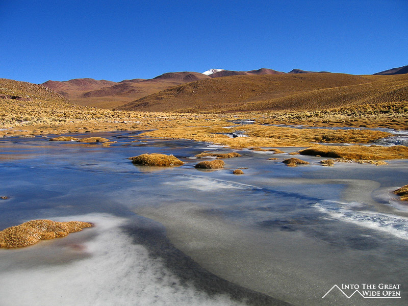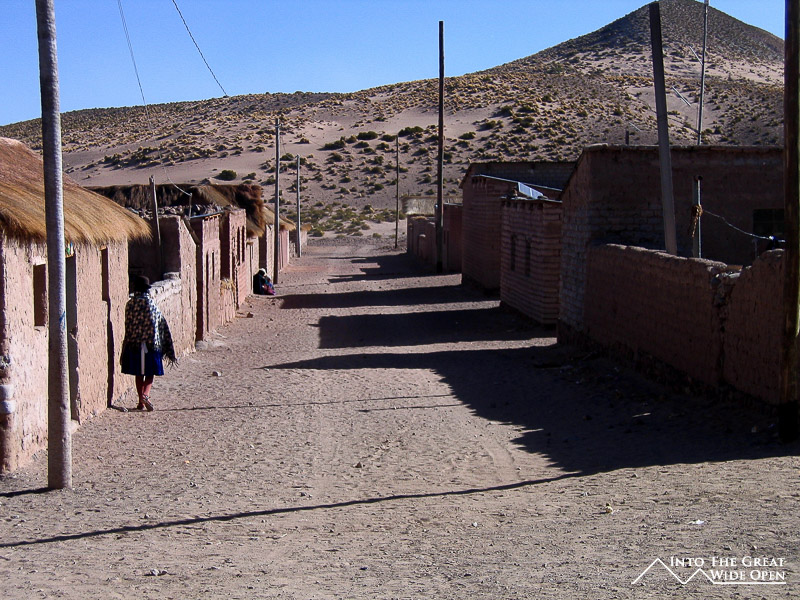 As we began to get higher in elevation we saw lots of ice on the few rivers and in patches on the ground. One of the rivers that we had to cross had ice that was almost an inch thick on it, and the older jeep in front of us had some trouble getting out of the river, probably because the tires were bald. Our vehicle had no problem and after crossing the river it was another hour or so drive to the little village at almost 4,300m where we spent the first night. The village had about 200 people and the people did some small scale gold mining and tended llamas. At night, the temperatures drop down to around -20C or -4F so it was very cold.