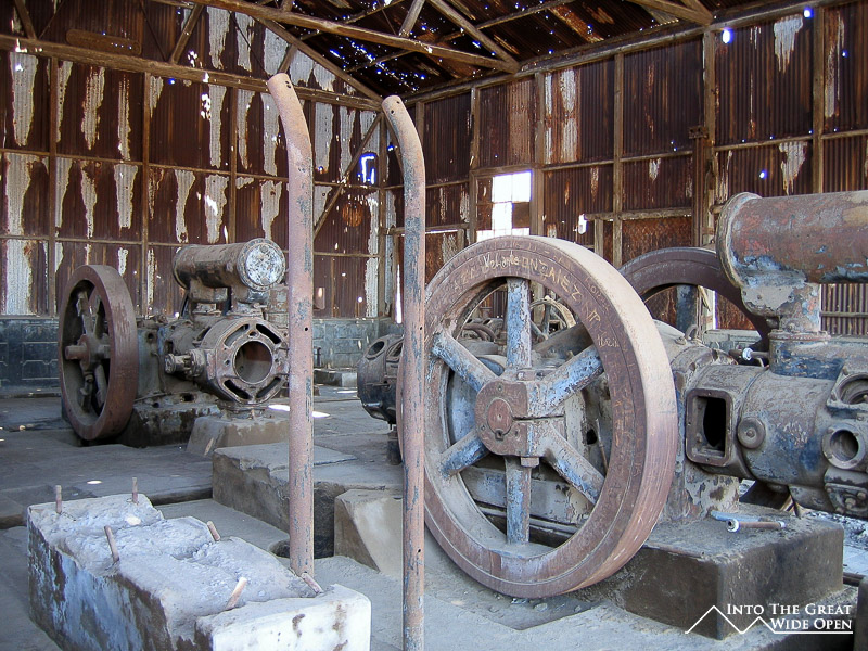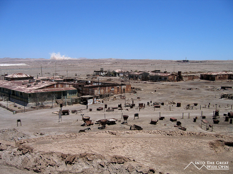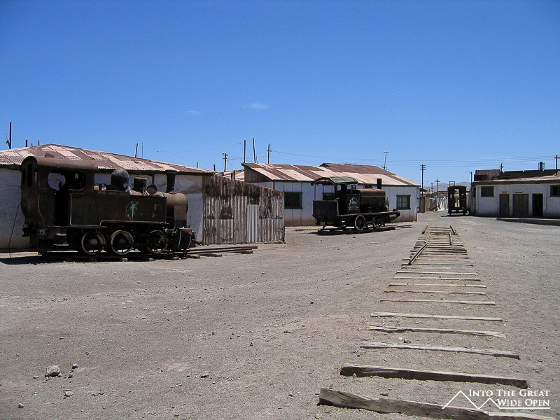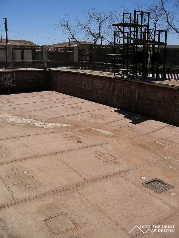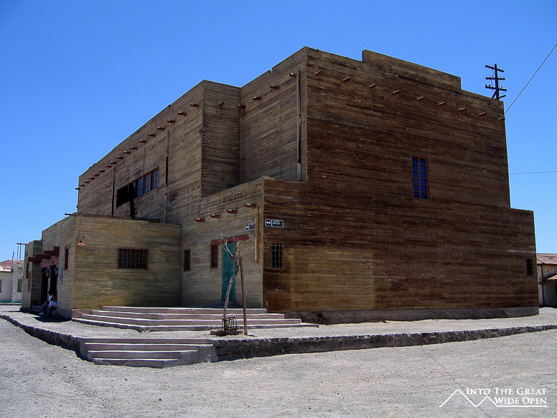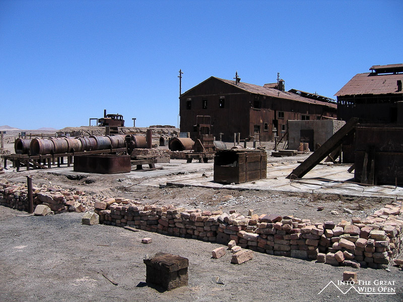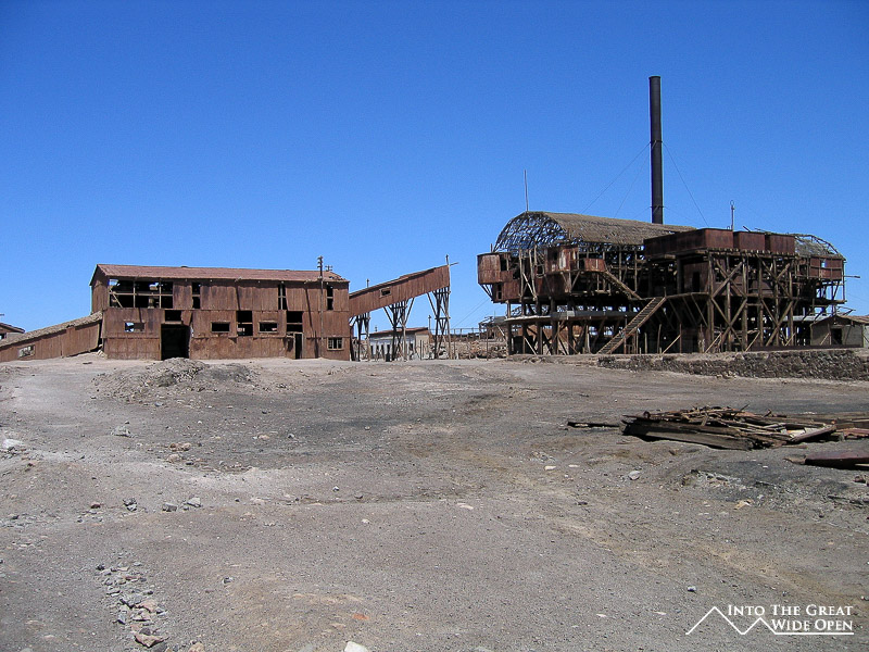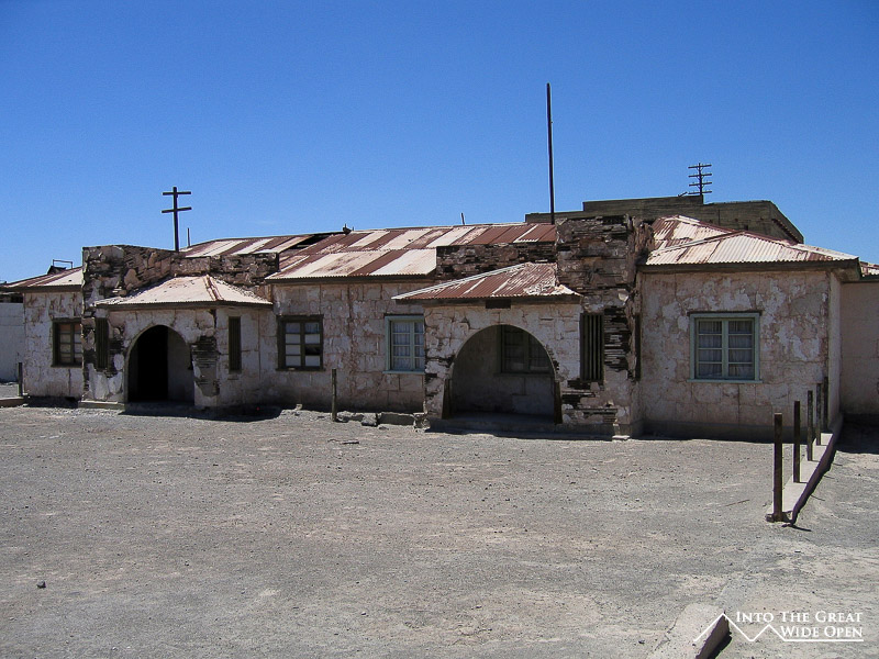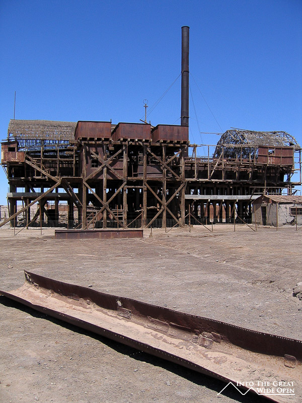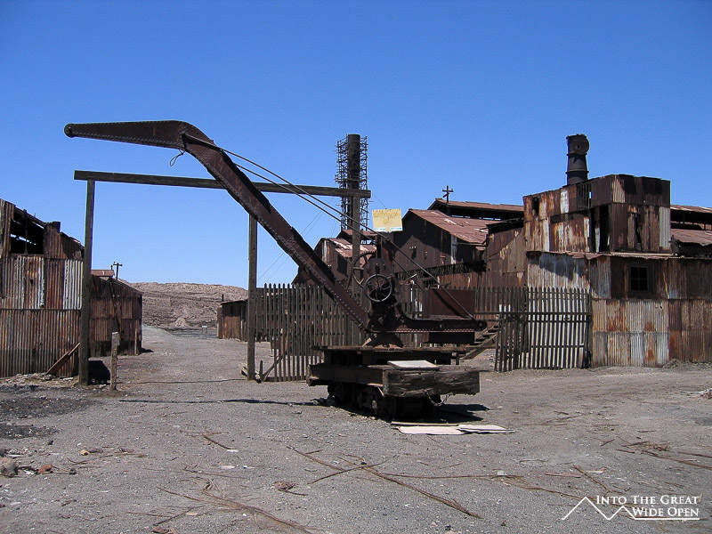 From Santa Laura I walked about a mile through the desert under the roasting sun to Humberstone. Humberstone was suprisingly large and almost all of it, save for a few buildings that had been restored, were in the original state. In the main plaza there is a building with all of the interesting bottles, cans, books, and other everyday items that had been found, some preserved amazingly well. Other than those, all the buildings were completely empty, long since stripped clean of anything of value or use. The town had been rather prosperous with a large theater for movies and plays and a swimming pool made from the bolted together metal segments of ship hulls; it even was complete with a diving platform, although I’m not sure where the water would have come from. Behind the town, further off the main road, are the mining buildings with all the old mining equipment. I was the only person of the few people visiting Humberstone to actually venture back there and it was eerie to walk through such a large deserted complex alone.