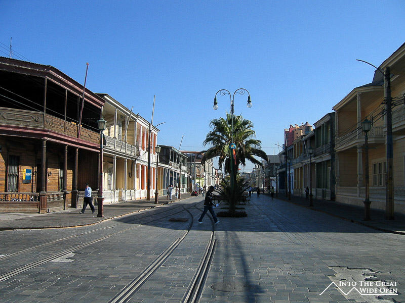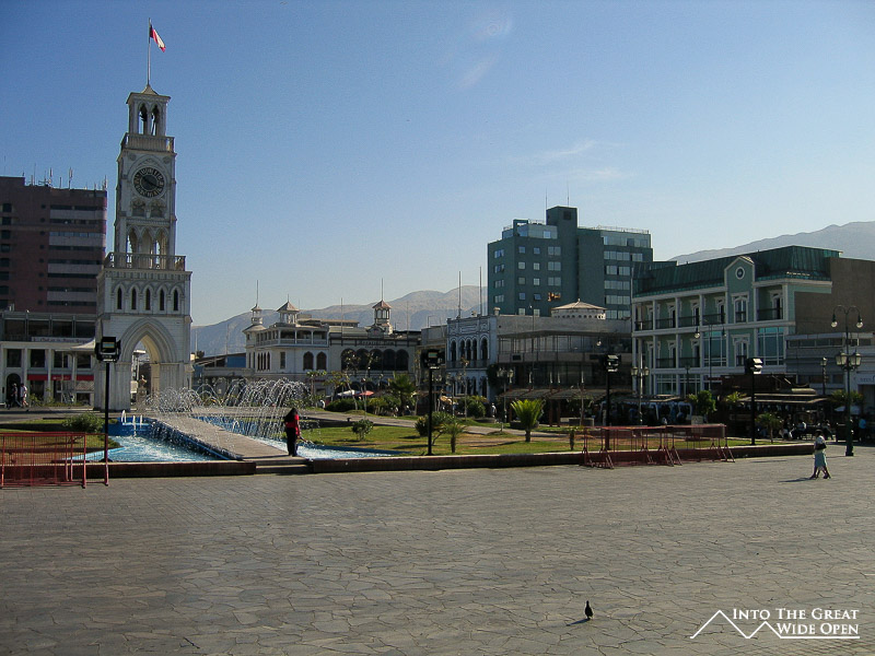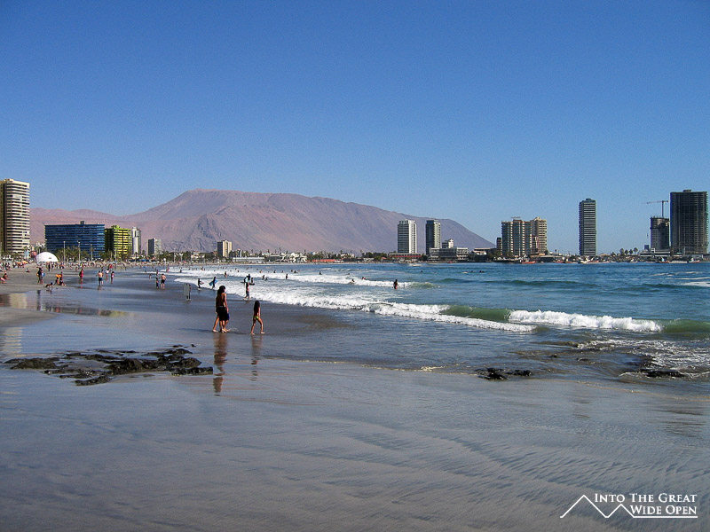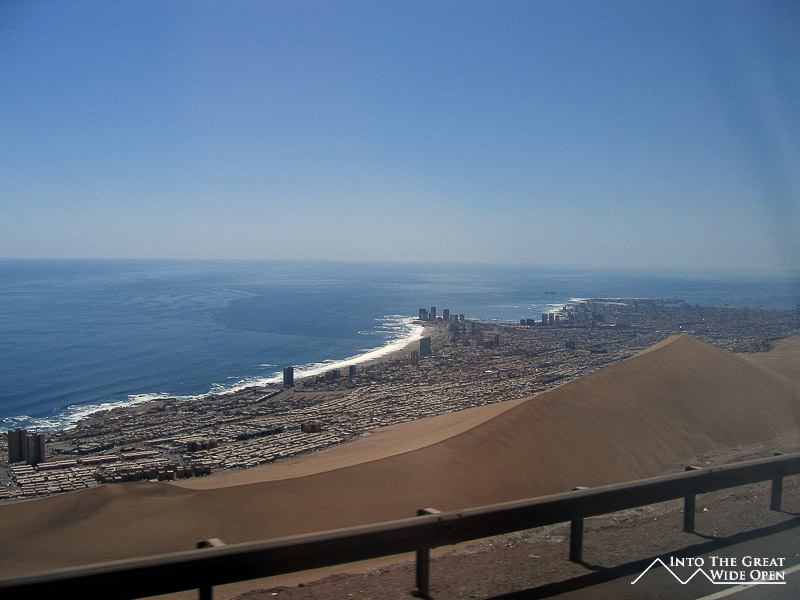 Iquique is one of those cities with such a dramatic setting that you will never forget the first time you see it. It is located about 4 hours south of Arica but the road runs right through the Atacama desert, a bone dry arid expanse of nothingness, before branching off at Humberstone, an old nitrate mining ghost town, to descend towards Iquique. The road winds downward through parched valleys and eventually reaches a small plateau between two taller mountains that extends in either direction high above the city. From here the ocean comes into view and you can see the entire city of Iquique narrowly confined between the coastline and the giant sand dune towering behind it.