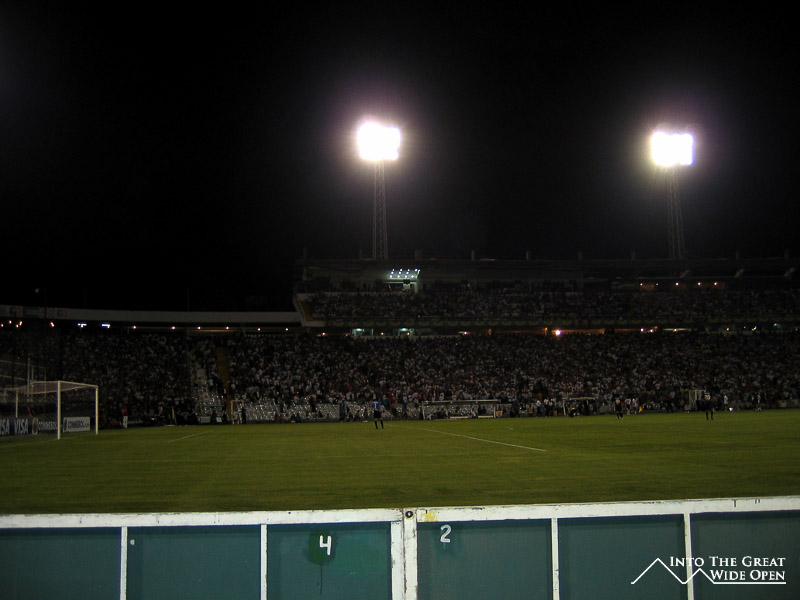 After this whole fiasco we had missed the first fifteen minutes of the game and the score was already 1-0 Colo Colo. There was another score later in the game and it never really got close with Colo Colo holding on for the win. In our section with the more expensive seats, things were rather tranquil, but in the cheaper seats at the ends of the stadium, enclosed by fences topped with barbed wire and staffed with riot police in the stairways at about 10 foot intervals, the fans were much more energetic, waving flags and jumping around in a sort of controlled chaos.