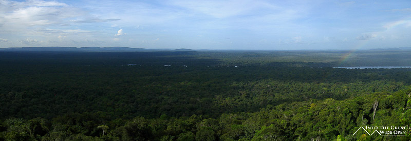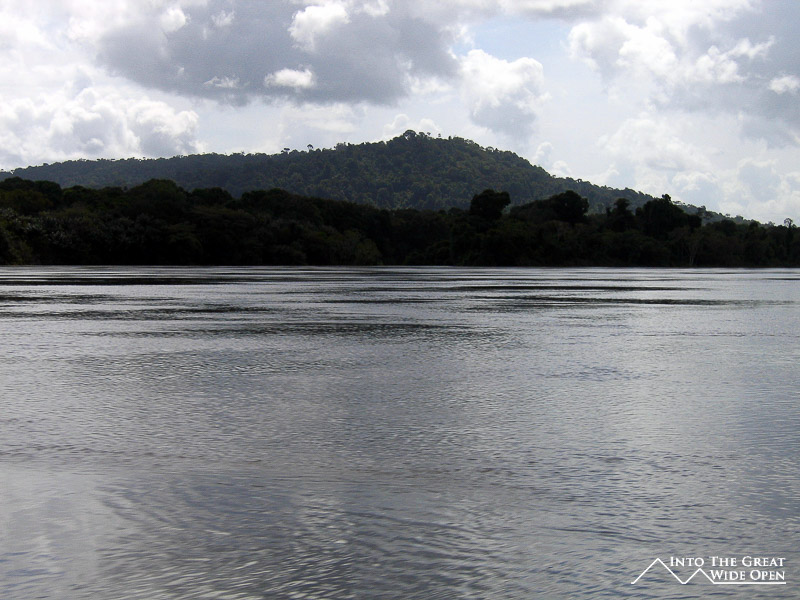 I decided to go on a hike to Turtle Mountain that involved a short boat trip followed by hiking through the jungle to the top of the mountain where you have views over the forest canopy below. The high water level meant that the boat needed to navigate through the submerged trees to reach an alternate landing site where we found a local indigenous man who had just finished hunting and having caught an armadillo and two other jungle rodents he was preparing to smoke them. Apparently smoking is the ideal way to prepare armadillo meat. The trail through the thick jungle was hot and humid and hadn´t been used in quite some time as we came upon one section that had been blocked by a downed tree. We saw several really interesting birds, including one that apparently is really rare and hard to find. But in terms of other animals we saw none, only the tracks of a jaguar along the trail. After a while we eventually reached the top of the mountain and were afforded amazing and sweeping views of the jungle canopy and mountain escarpments off in the distance. From our perch on top of the mountain we could look down on flocks of parrots, macaws, and other birds and listen to the distant sounds of the howler monkeys establishing their territory.