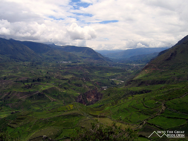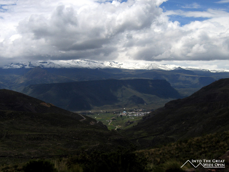 Everywhere I looked the tour operators were advertising Colca Canyon as the world´s deepest canyon, which is in fact not true. Personally, I dispute the fact that it is a canyon, but I´ll get to that later. The deepest canyon is actually Cotohausi Canyon, several hours north of Colca Canyon, which at its deepest point is about 150m deeper than Colca Canyon. If you believe the numbers, Colca Canyon is around 10,000 feet deep. The reason that I dispute its status as a canyon is that it is really more of a gradually sloping river valley than what you would traditionally think of as a canyon. Rising up from the river is a hillside of terraces that leads up to a small plateau and then from that plateau the mountains rise up to the snow covered peaks.