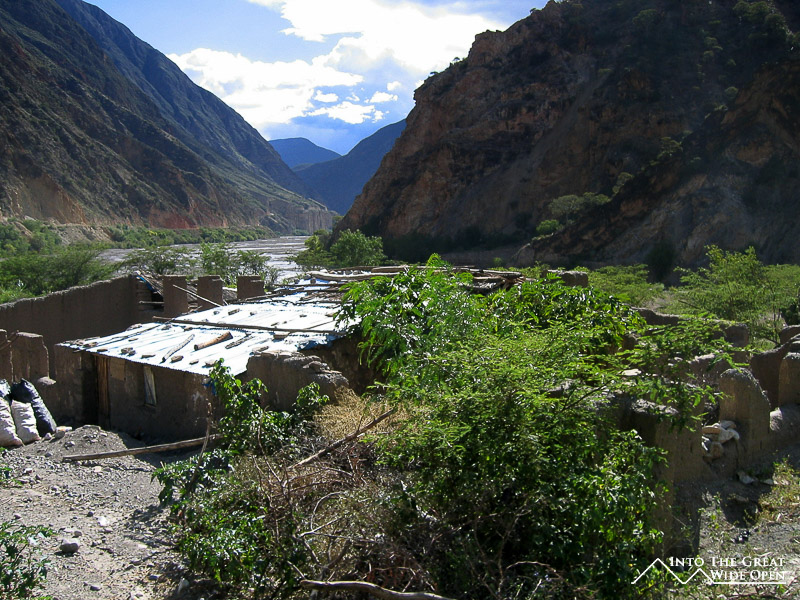 The dust was continually blowing into the bus as we descended the switchbacks and the air was hazy and dry. The road continued along the river for a while and at one point the bus stalled while crossing a mostly dry riverbed. The driver couldn´t get the engine to start after several tries and then he yelled for all the men to get out of the bus to push it out of the riverbed to get it rolling so he could try to start the engine on the downhill slope. I got out of the bus with the other men and we pushed it up the small hill out of the riverbed and the driver was able to start the engine. The dirt road continued along the river for a while before crossing back over the river and turning to the south as we drew closer to Huallanca. We passed through this small town amidst the arid desert like conditions and this town was so dry that the soccer field was all dirt and didn´t have a single blade of grass, and in South America that says something. The bus stopped to let some people off, as there was a row of decrepit houses leading up the hillside; there were probably more abandoned houses than inhabited ones.