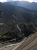 The road continued a little further toward Huallanca, passing through the old section of town first, with a horid looking shanty town of hovels down off the main road with patchwork corrugated metal roofs and crumbling walls with maybe one in every three inhabited. There was a school that looked closed, overgrown, and dilapidated, a few stores, and a police post. Past the old section of town we reached what appeared to be a huge prison, heavily fenced in with barbed wire. The complex was actually owned by Duke Energy as part of the large hydroelectric power plants they have in the river gorge. The complex was nice and new with well-painted and maintained buildings, a few watered grass fields as part of an athletic complex and lots of satellite dishes and other modern conveniences. Unlike a prison, the security was likely designed to keep the townspeople out. It didn´t appear that there was much giving back to the community here. As the road passed the complex, it became better maintained and continued up the hill to a series of ten or more single lane unlit tunnels bored through the mountains. As the road climbed, the river thundered through the gorge way below as it narrowed to distances of maybe 20 feet across as the sides rose steeply up thousands of feet. There was one dam built with a water spillway passing through to the side in a channel cut into the canyon walls, where a waterfall made a thundering drop and then turned ninety degrees to flow back down to rejoin the river.