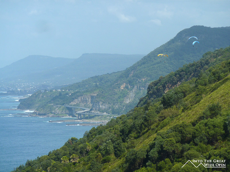 Paragliders over Grand Pacific Drive on the way to Wollongong